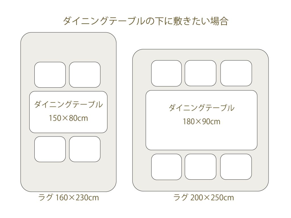 ダイニングテーブルの下にカーペットを敷く場合は、フローリングのキズ防止や使い勝手の良さも考慮しましょう。一般的に、成人が椅子を出入りする際に必要なスペースは70〜80cm程度とされています。これより短いと、椅子の後ろ脚がカーペットからはみ出して床に当たったり、カーペットがずれてしまうことがあります。