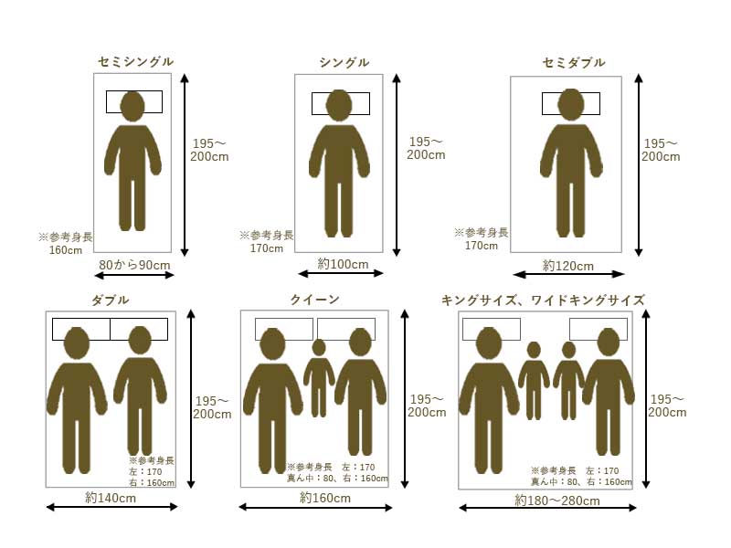 セミシングルからキングサイズまで、横幅の目安や使用人数のイメージが一目でわかります。