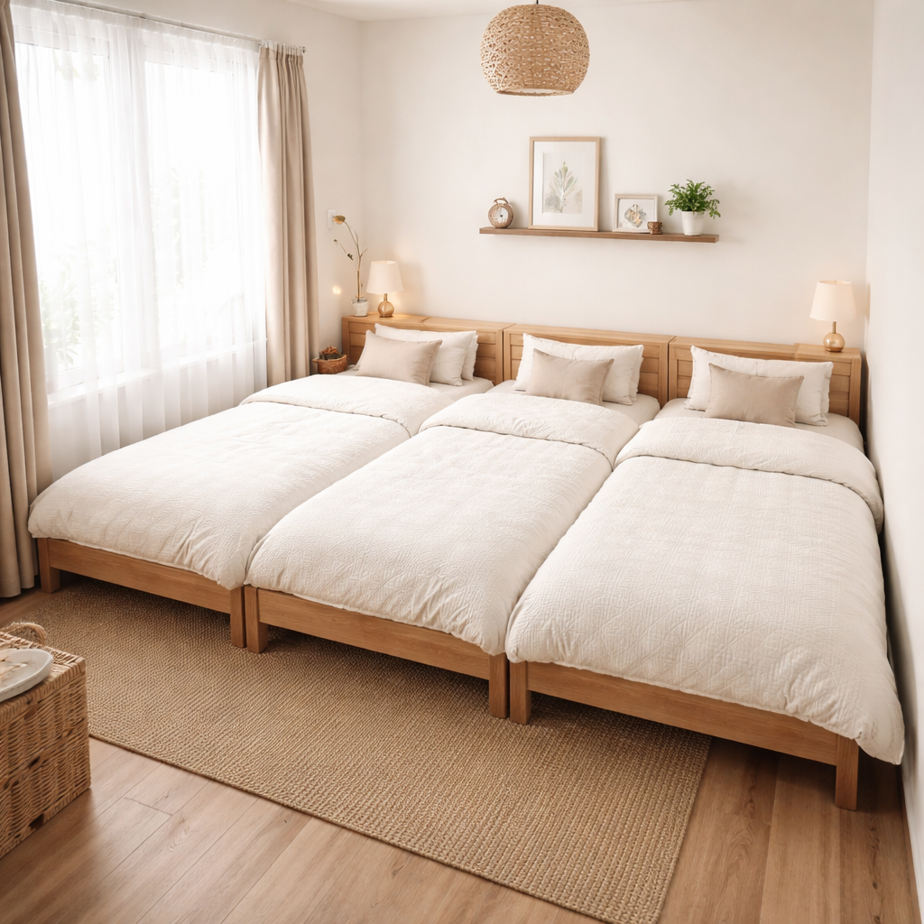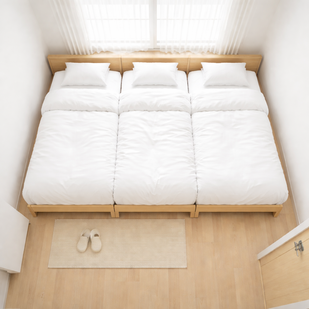 例えば、8畳の正方形タイプのお部屋であれば、ダブルベッド1台+シングルベッド2台を配置することも可能です。