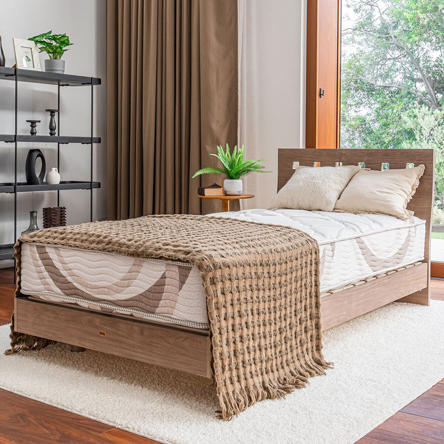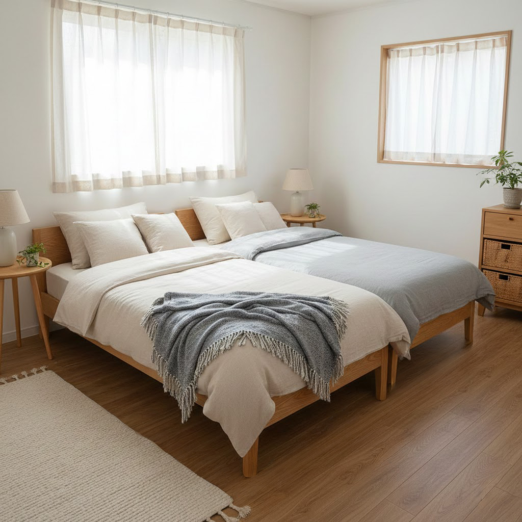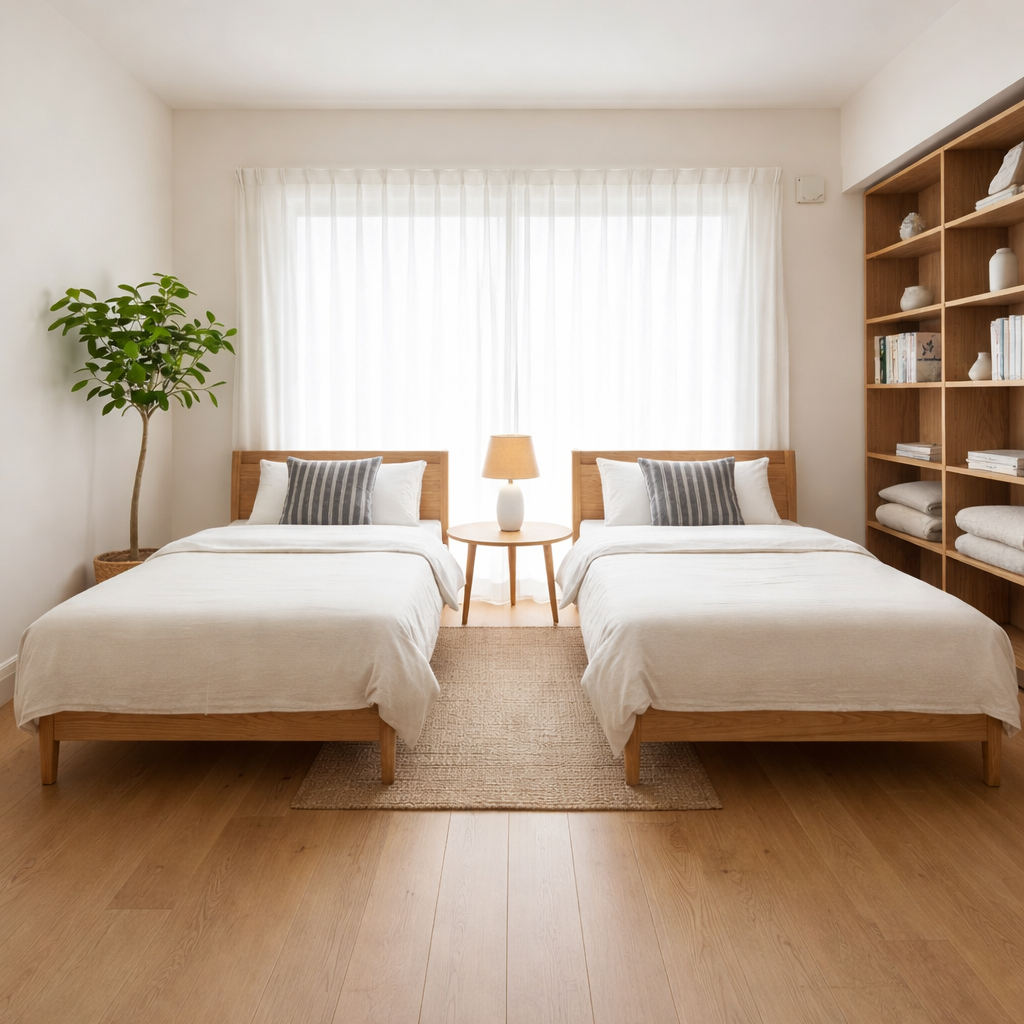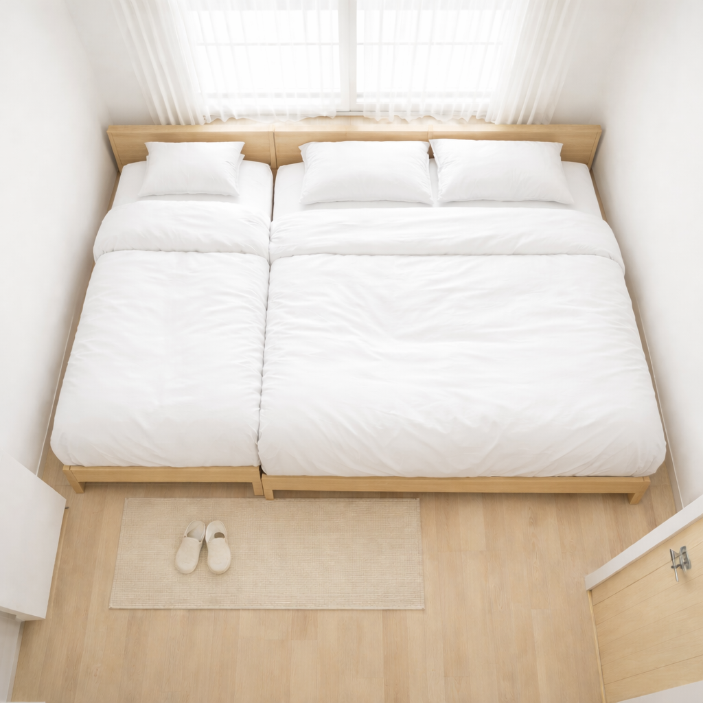 たとえば、シングルベッドを2台並べて一人1台ずつ使うスタイル。お互いの睡眠リズムを保ちやすく、将来的にレイアウト変更もしやすい柔軟な選択です。ぴったりとくっつければファミリー仕様の広々ベッドとしても使え、少し間を空ければサイドテーブルを置くこともできます。