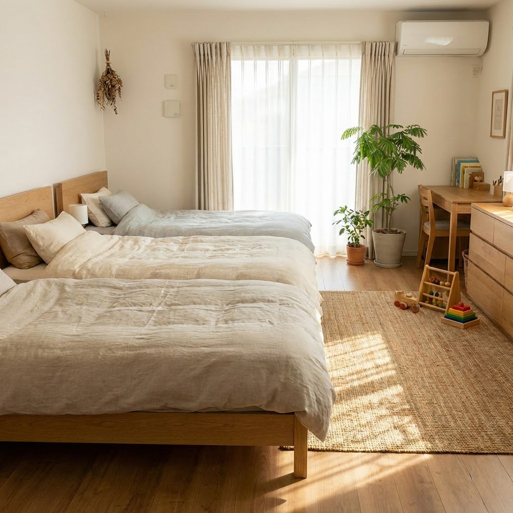 ぎりぎりまでベッドを置き、3人〜4人で川の字になって眠ることで、家族全員が安心して眠れる環境をつくることができます。