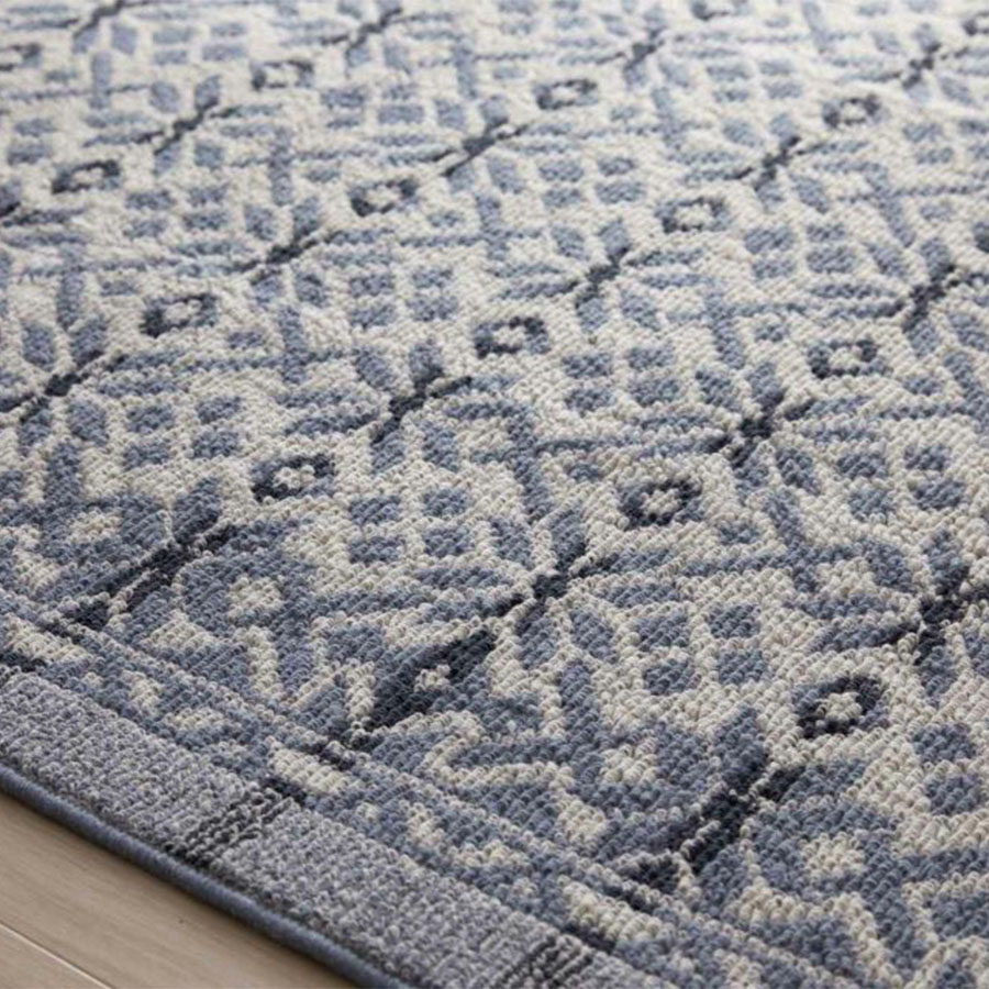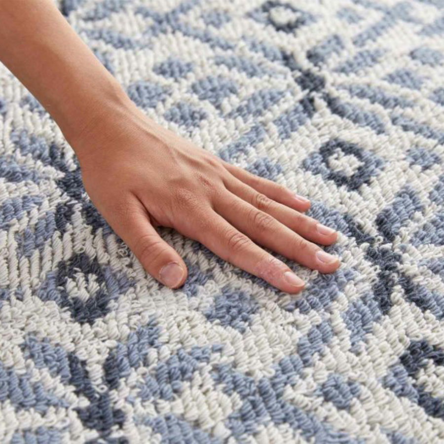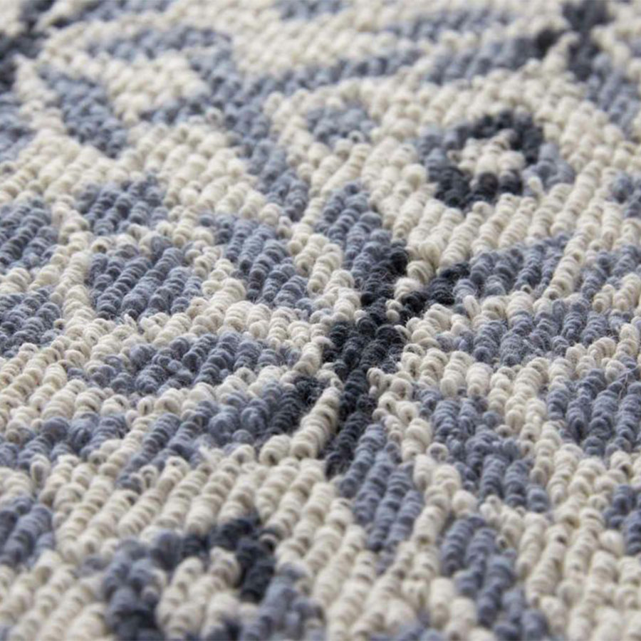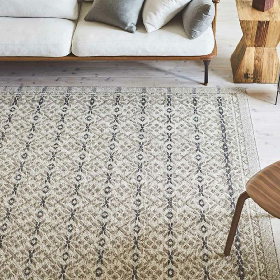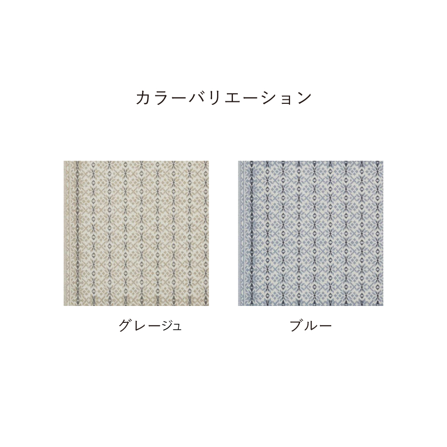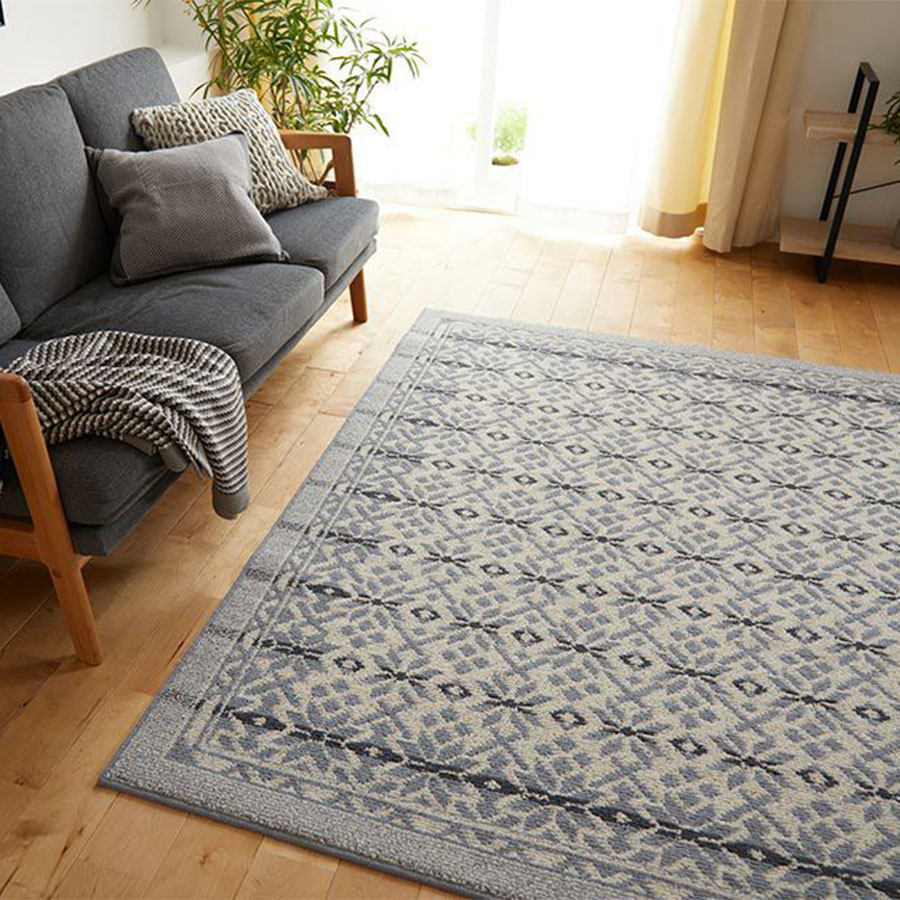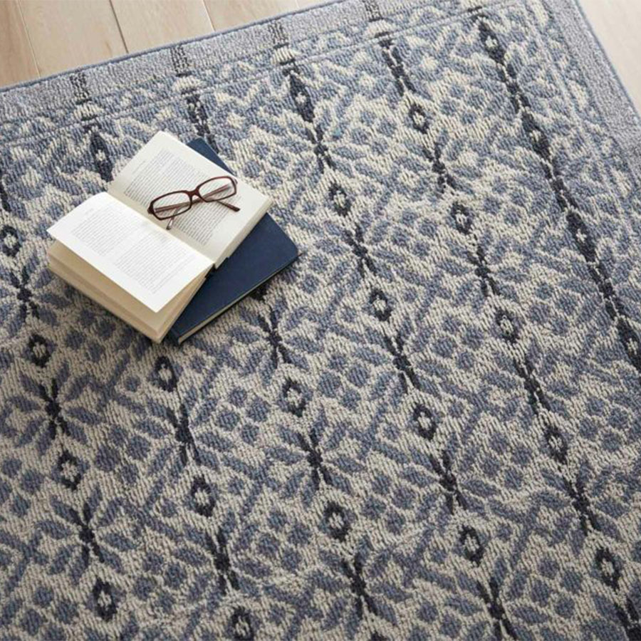 ノルディックニットがモチーフ。 ノルウェーの白夜をイメージした美しいグラデーション柄と、伝統柄の中でも代表的な雪の結晶のモチーフをアレンジ。 北欧カラーとニットのようなふっくらとしたテクスチャーのカーペットです。 長く使っても飽きの来ない北欧カラー全2配色展開。 ベージュ配色は、有色羊毛という羊本来の毛の色を調合することで配色を出しています。 その為、天然素材ならではの深みのある色味を可能としています。 また染料を使用していない為、地球に優しい糸です。ブルー配色は、ノルウェーの冬を思わせる、落ち着いたトーンに仕上げました。