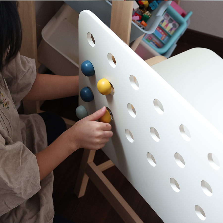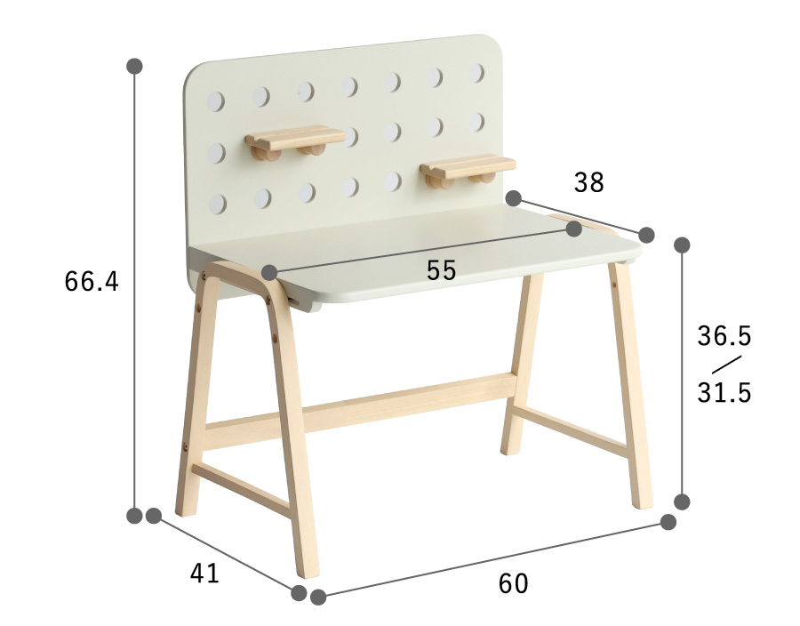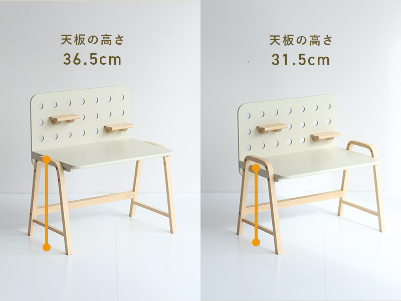 デスクの高さは2段階で調整できるので、成長に合わせて長くお使いいただけます。幼児期の遊び机から、学習机へのステップアップにもぴったりです。