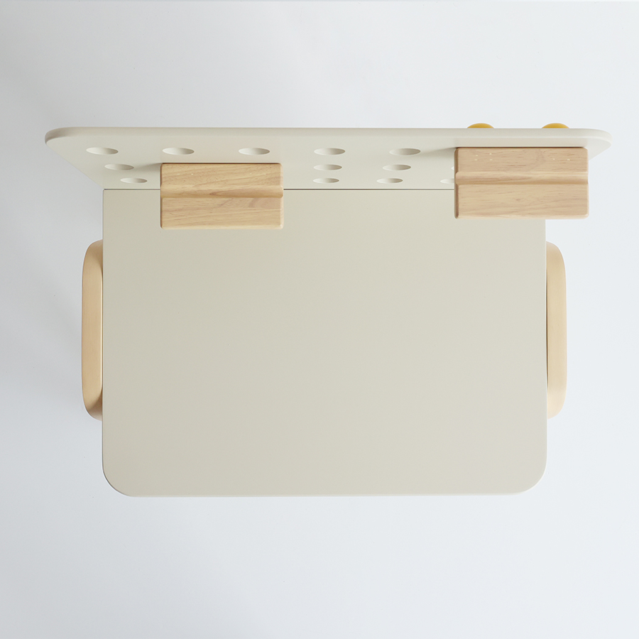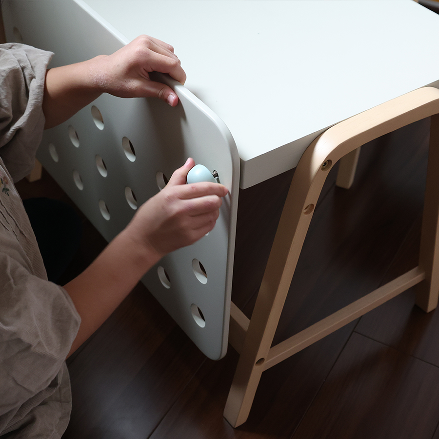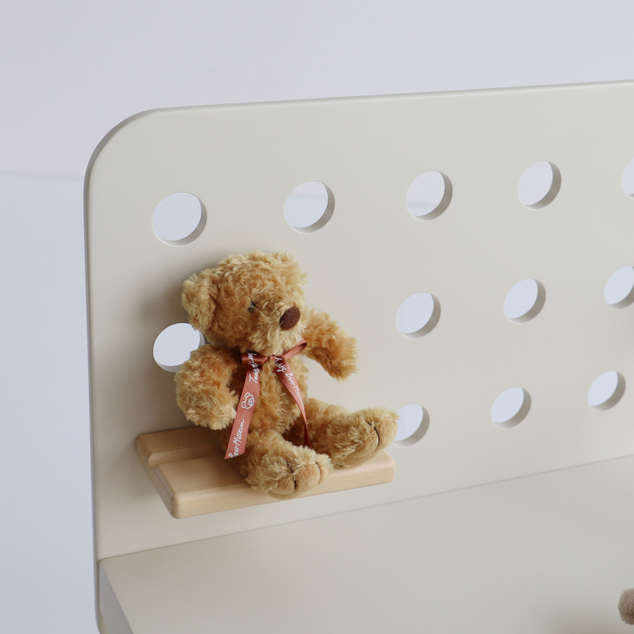 可動式の棚板が付いたデスクは、おままごとスペースやおもちゃ棚、タブレットスタンドなど、用途に合わせて自由にカスタマイズできます。