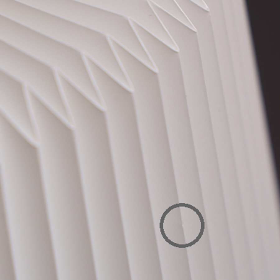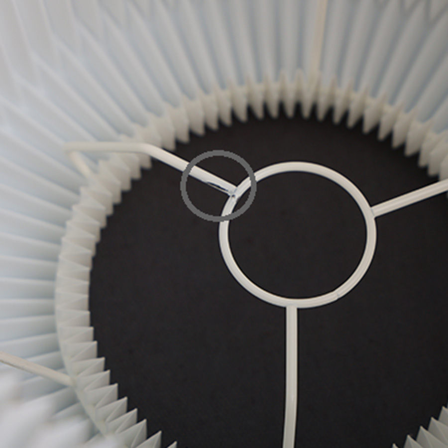シェードに爪で軽く押したような跡がある場合があります。 これは、職人がひとつひとつのシェードを手で折り上げる工程で生じるものです。シェードのプリーツの山にあたる部分に、小さなへこみが生じる場合があります。