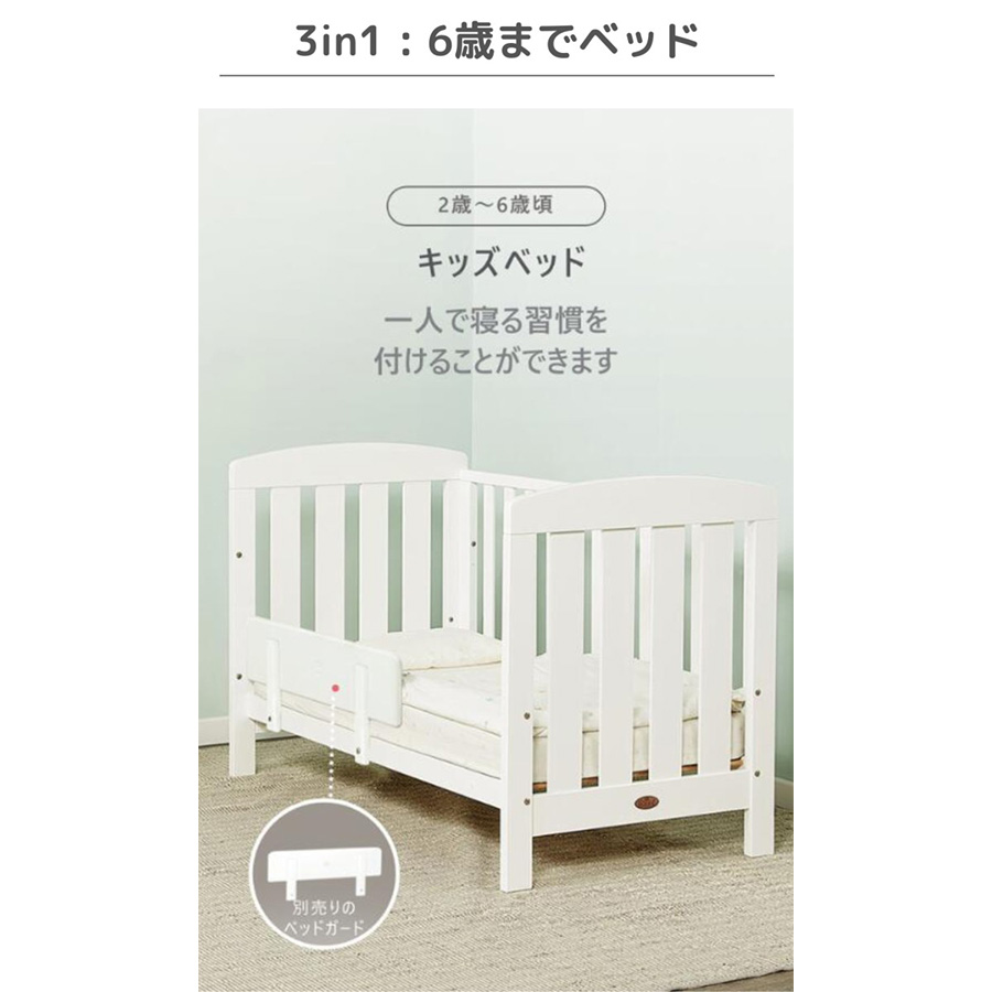 Boori アリス コットベッドは、ベビーベッドから幼児用ベッド、さらにソファへと形を変えながら長く使えるコンバーチブル設計。 新生児から約5歳頃まで、お子様の成長に合わせて快適な眠りの空間を提供します。 長く使えるからこそ、家計にもやさしい一台です。