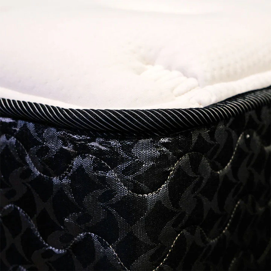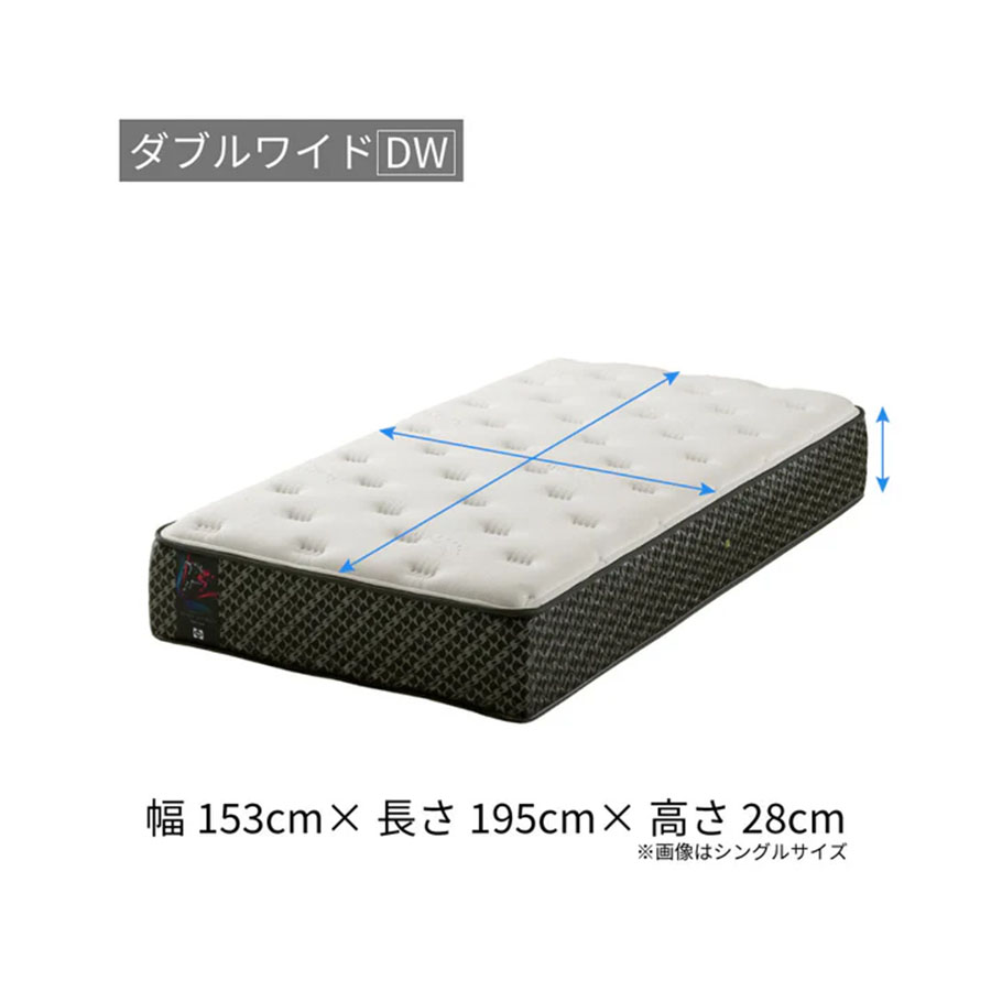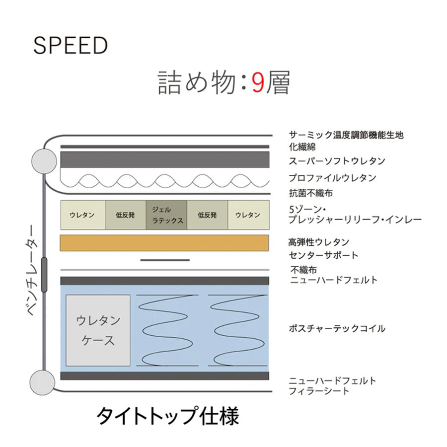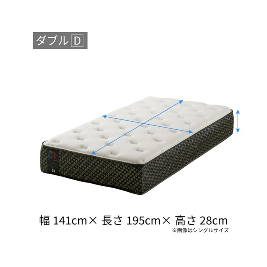 | 素材 | 詰め物:9層 表布:ニット(ポリエステル63.3%、レーヨン36.7%) クッション層:5ゾーン、プレッシャーリリーフ、インレー、センターサポート内蔵 コイル:ポスチャーテックコイル コイル内蔵数:(S)403個、(SD)527個、(D)620個、(DW)651個 エッジサポート:ウレタンケース 生産国:日本 |