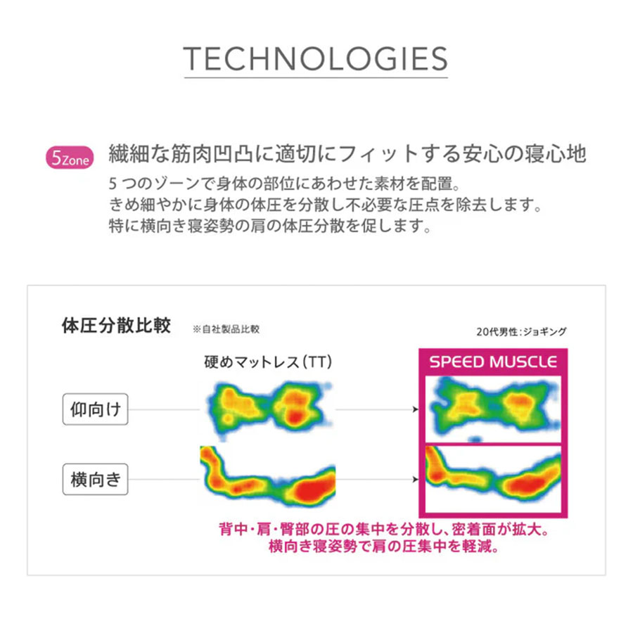 5つのゾーニングで身体の部位に合わせた素材を配置。きめ細やかに身体の体圧を分散し不必要な圧点を除去します。特に横向き寝姿勢の肩の体圧分散を促します。