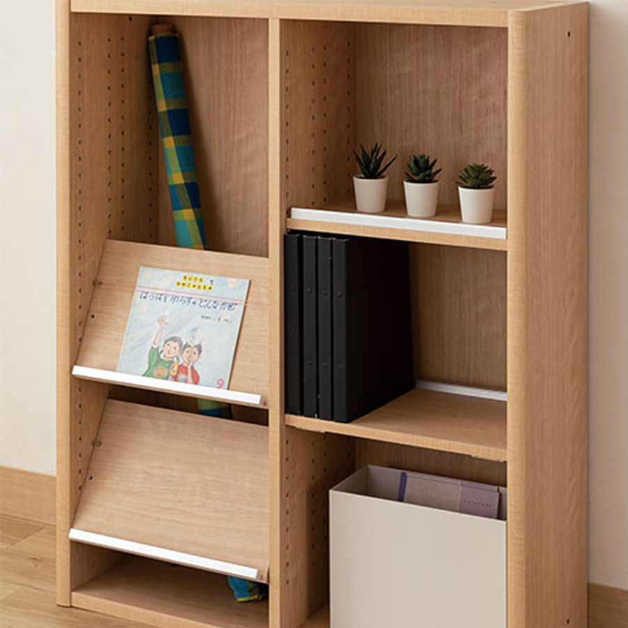 ディスプレイ棚は垂直・傾斜・水平の3タイプに設置でき、表紙を見せるディスプレイや収納物の転落防止など用途に応じて活用可能です。