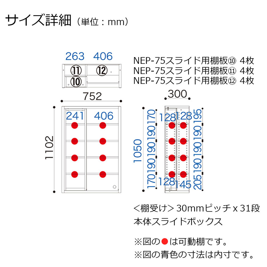 スライド用棚板:4枚 本体用棚板(左):4枚 本体用棚板(右):4枚 |
