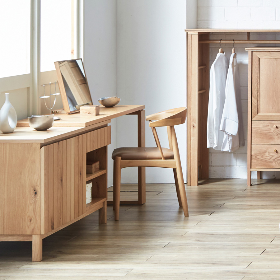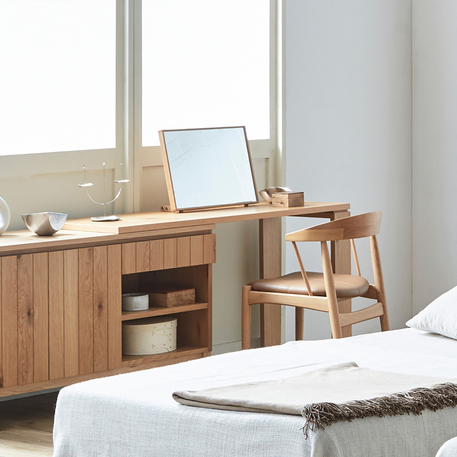 ナチュラルな木目がやさしく光を受け止め、デスクやチェストと並べれば、シックで統一感のある空間を演出します。