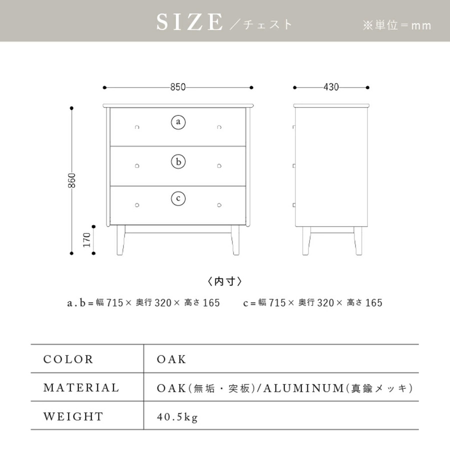 幅85×奥行43×高さ86cmというゆとりあるサイズ設計により、洋服や小物の収納はもちろん、天板上に雑貨を飾るディスプレイスペースとしての活用も可能です。 日常生活の利便性と収納力を両立した実用的な一台です。
