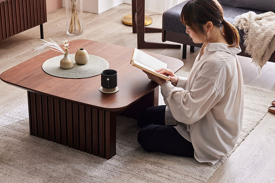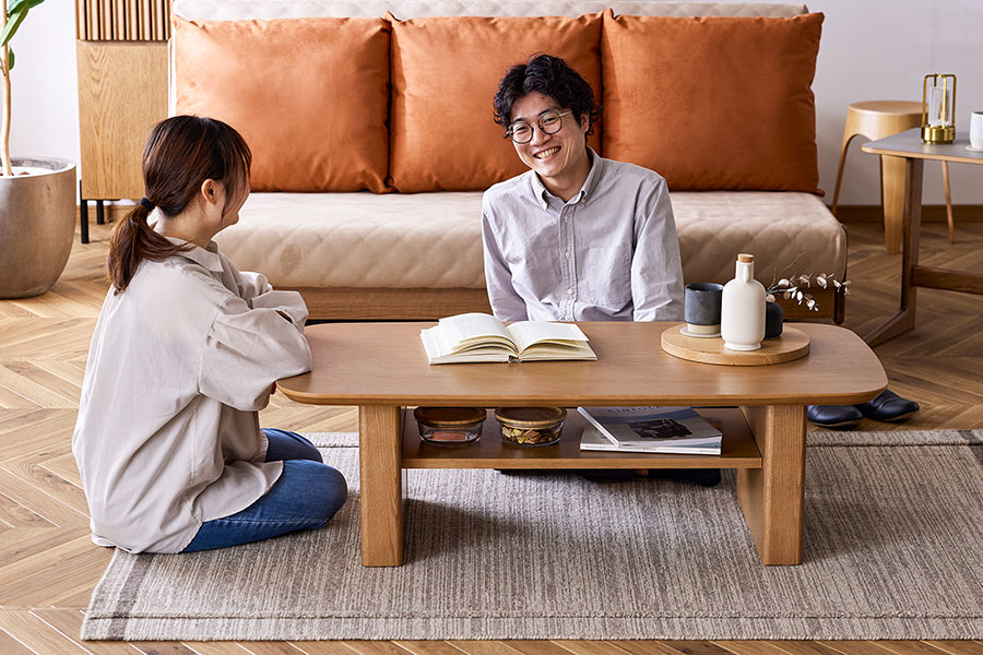 脚や棚板をセットバックさせ、高さも36cmに抑えているので、脚を差込み床で過ごすスタイルでも使いやすいように設計しています。