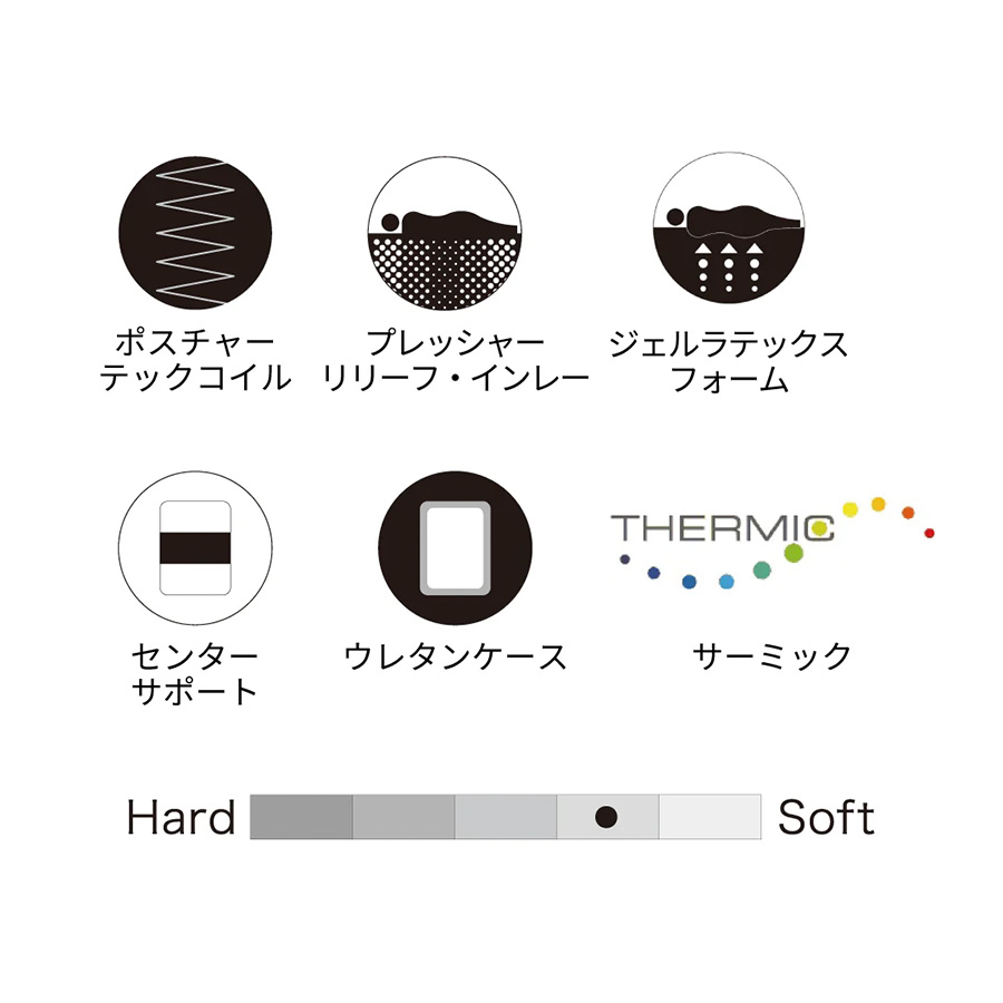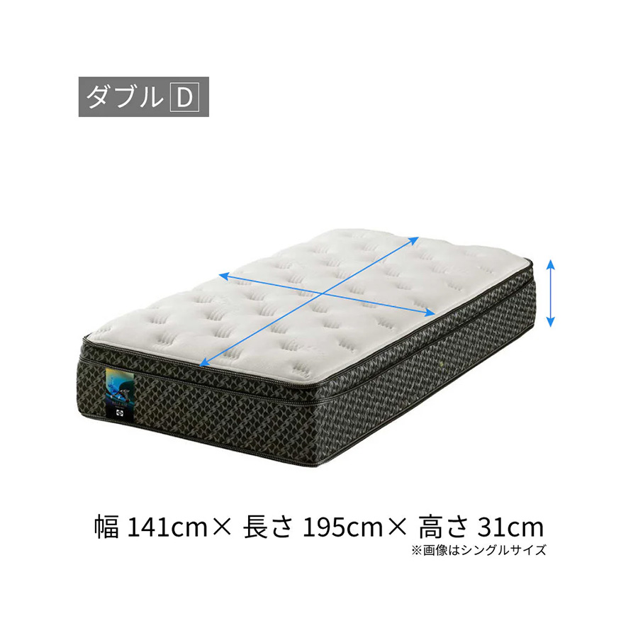 | 素材 | 詰め物:11層 表布:ニット(ポリエステル63.3%、レーヨン36.7%) クッション層:5ゾーン・プレッシャーリリーフ・インレー内蔵 コイル:ポスチャーテックコイル コイル内蔵数:(S)403個、(SD)527個、(D)620個、(DW)651個 エッジサポート:ウレタンケース |