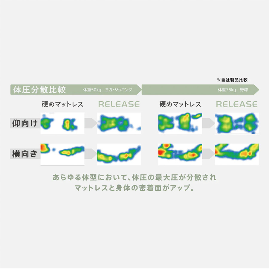 鍛えられたアスリートたちのマッスルの付き方を熟議し、 体型に応じた理想的な寝姿勢を研究・開発してきました。 スーパーソフトウレタンをプラスすることで、ソフト感を高め、フィット感・包み込まれる安心感を提供します。