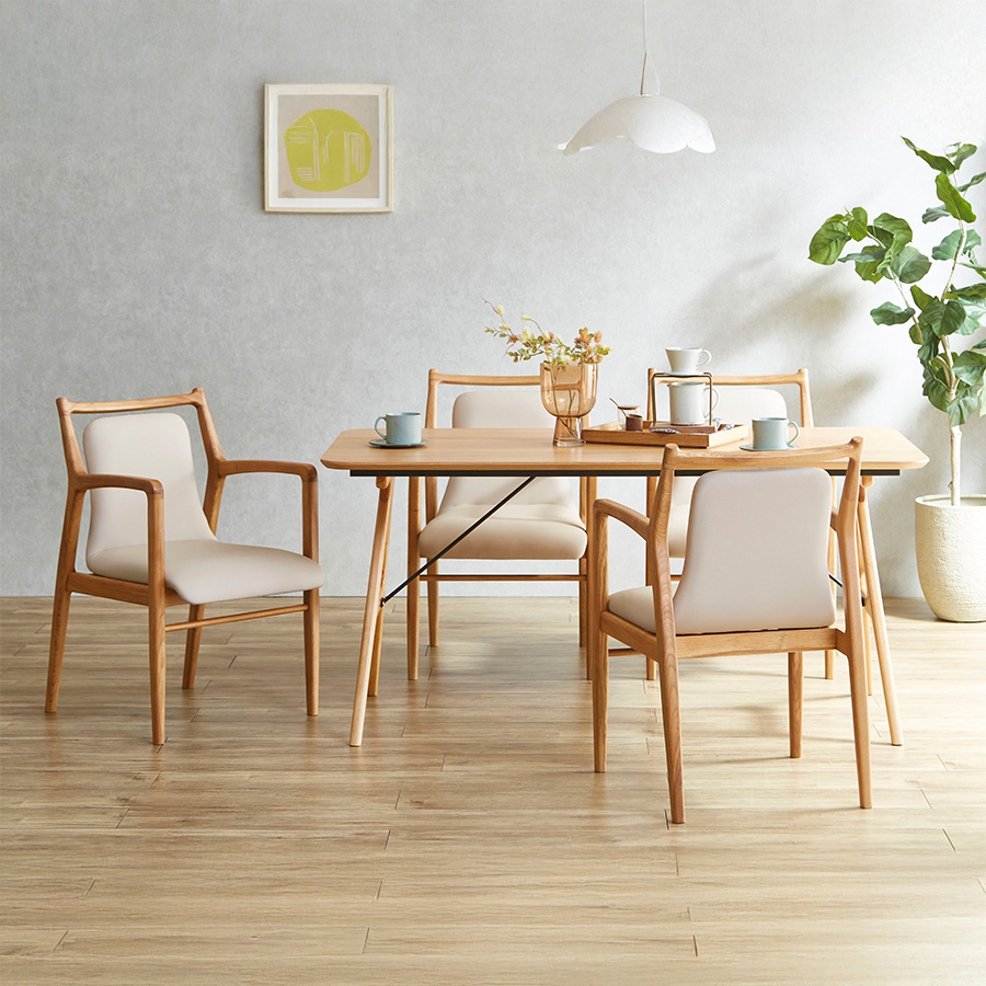 フレームにはウォールナット・オーク材を使用。 木のぬくもりと質感が食卓にやさしい印象を与え、手触りも滑らかで長く使うほどに味わいが増します。 汚れやすい座面部分にはPVC(合成皮革)を使用しているため、汚れてしまってもすぐに拭き取れば清潔に保てます。