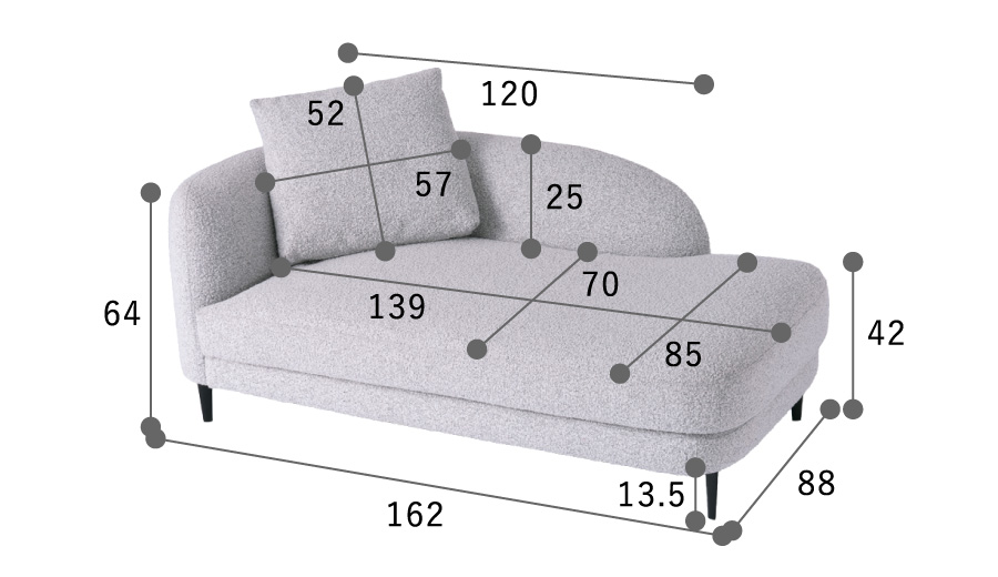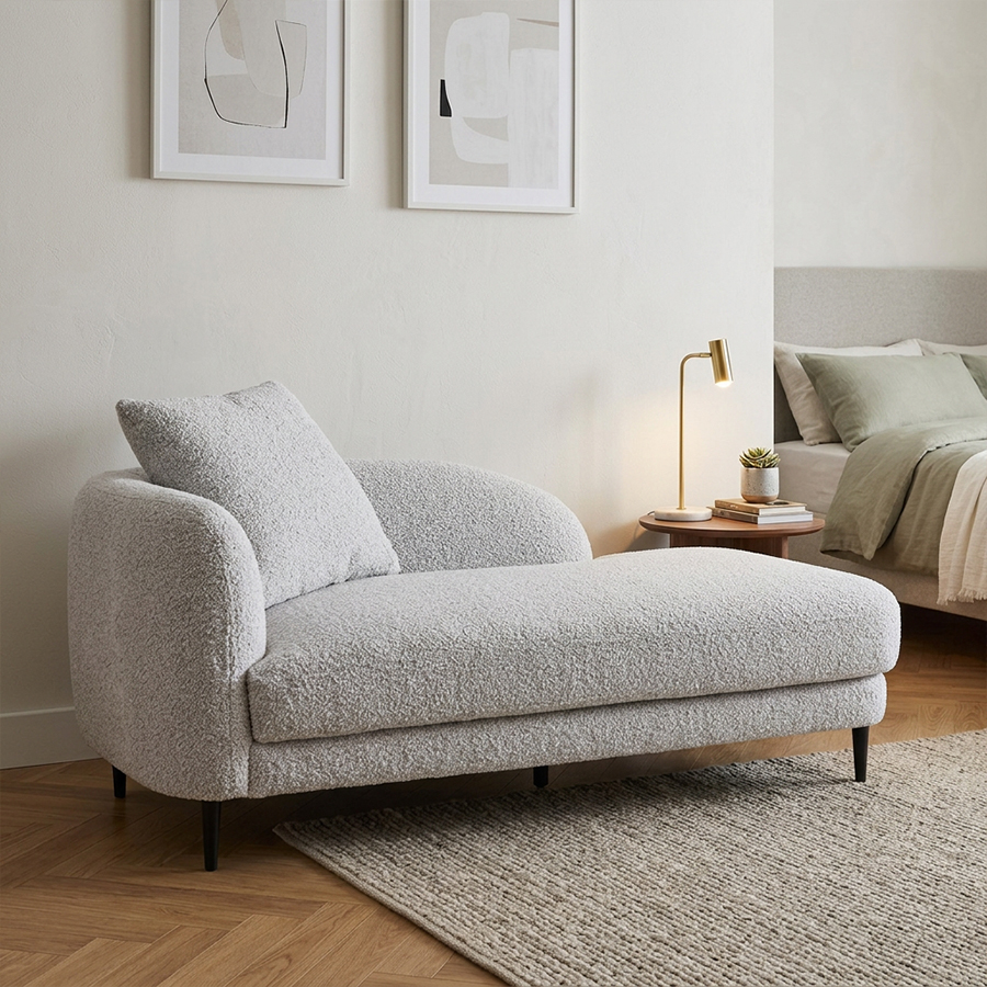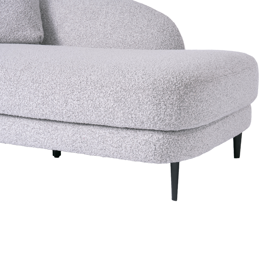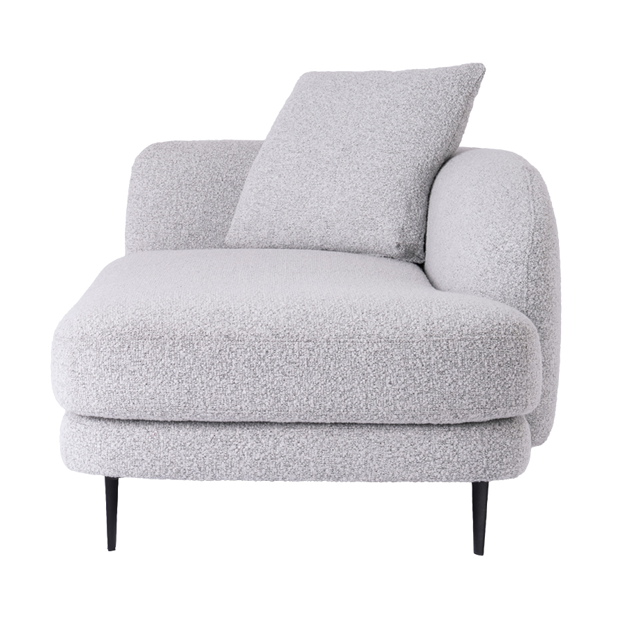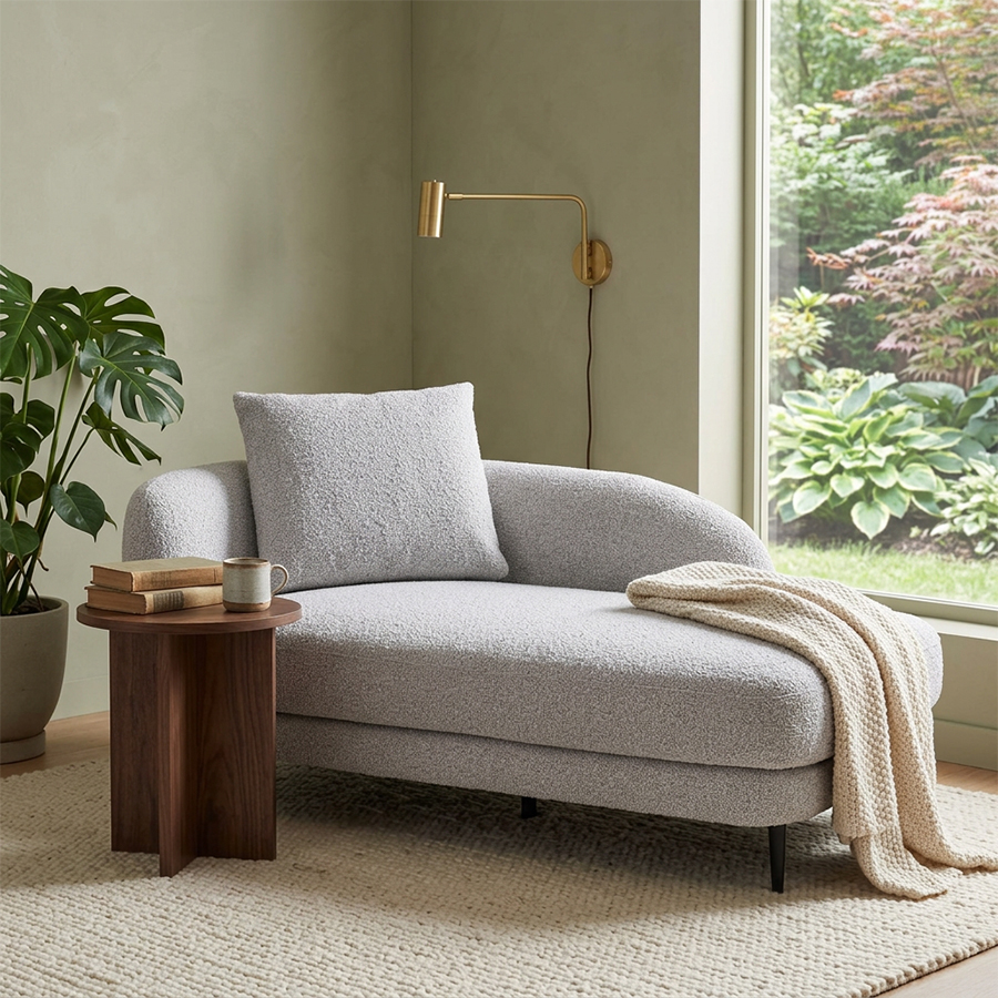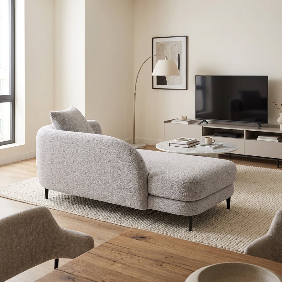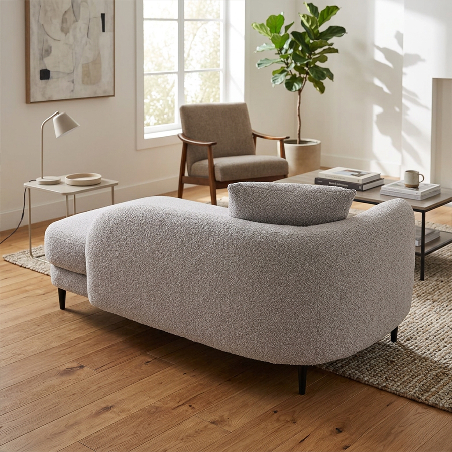 丸みのあるやさしいフォルムが印象的なシェーズソファ。 空間に自然と溶け込み、落ち着きとぬくもりを感じるリビングを演出します。 どこから見ても美しく、空間の主役としても心地よく馴染みます。